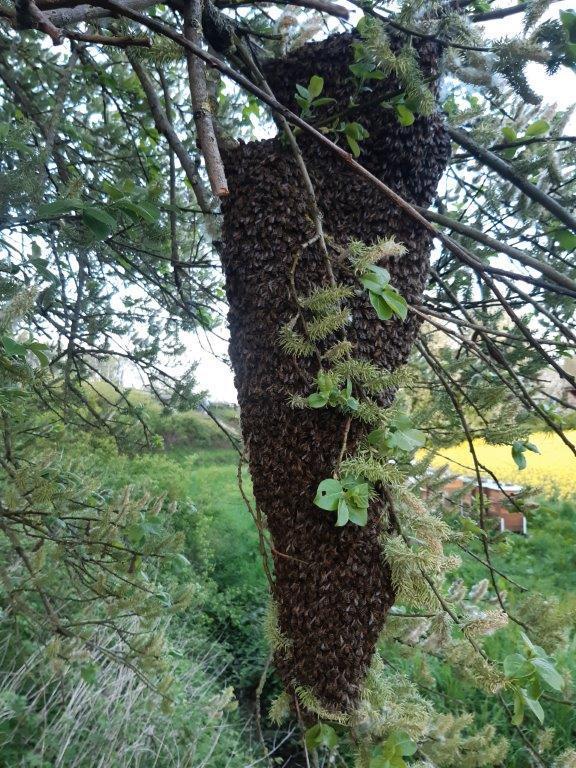 Und im Übrigen: Es muss nicht immer ein solcher „Monsterschwarm“ sein wie ihn die Wirtschaftsvölker am Rapsfeld hervorbringen. Diese unnatürlichen Volksgrößen sind das Resultat der Bewirtschaftung durch den Imker, große Beutenvolumina, große Völker, große Schwärme.